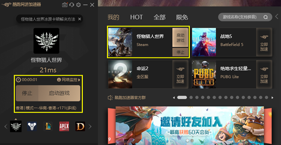 在游玩怪物猎人世界这款游戏的时候我们先从酷跑加速器的官网【https://www.kupao.com/】下载酷跑加速器客户端,同时在官网完成注册。下载安装完成以后,我们就可以登录加速游戏了,在添加游戏列表搜索相关游戏,找到立即加速即可!
